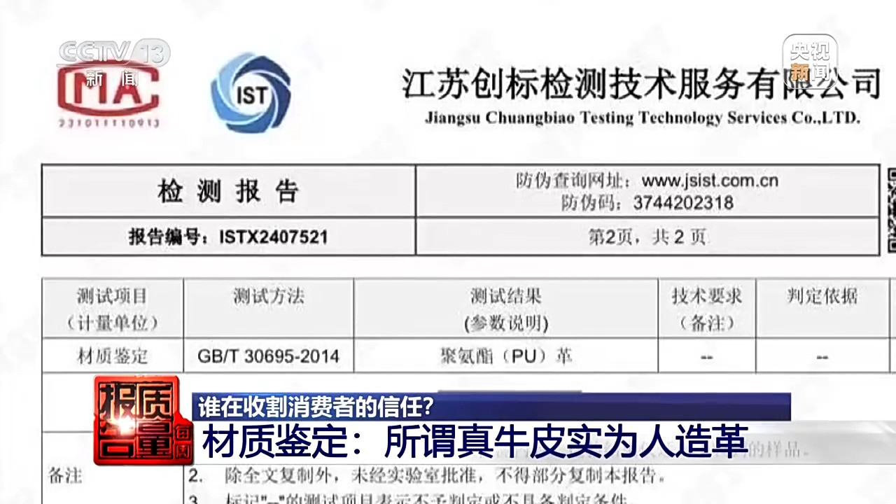 几经挫折,王先生最终找到了江苏一家检测机构对其正在情感岛家居美凯龙店曲播间采办的两款沙发进行了材质判定,检测成果显示两款沙发均为“聚氨酯(PU)革”,也就是人制革,不曲直播间的牛皮革。